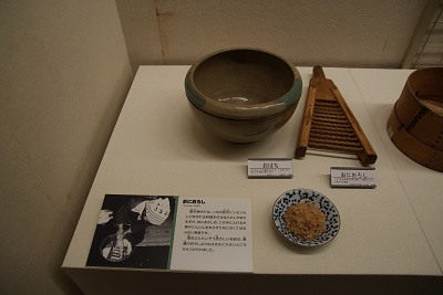 現在、開催中の「おじいさんとおばあさんの子どものころの暮らし」では、「しもつかれ」のサンプルと一緒に「おにおろし」を展示しています。