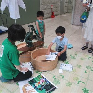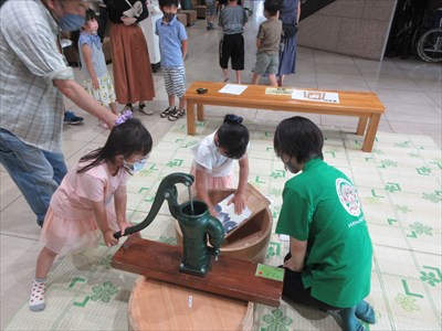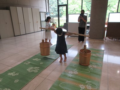 7月18日の海の日、博物館でやってみよう!「昔のくらし体験」を実施しました。今回は、子どもたちと一緒に洗濯桶と水桶を使用して、昔の水汲みと洗濯を体験しました。