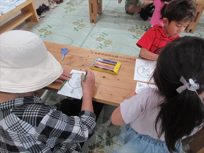 続いて色塗りです。色鉛筆で好きな色に塗ってもらいました。