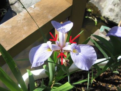 上の写真には、「ナスヒオウギアヤメ」と「アヤメ」が写っていますよ。