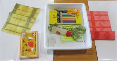 もようをつけたら、切って、ひもをつけたらかんせい!