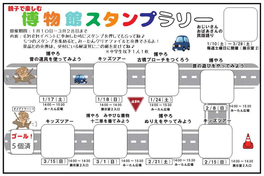 以下のイベントに参加し、スタンプを5つ集めた来館者は景品「みーたんクリアファイル」を差し上げます。(中学生以下限定)