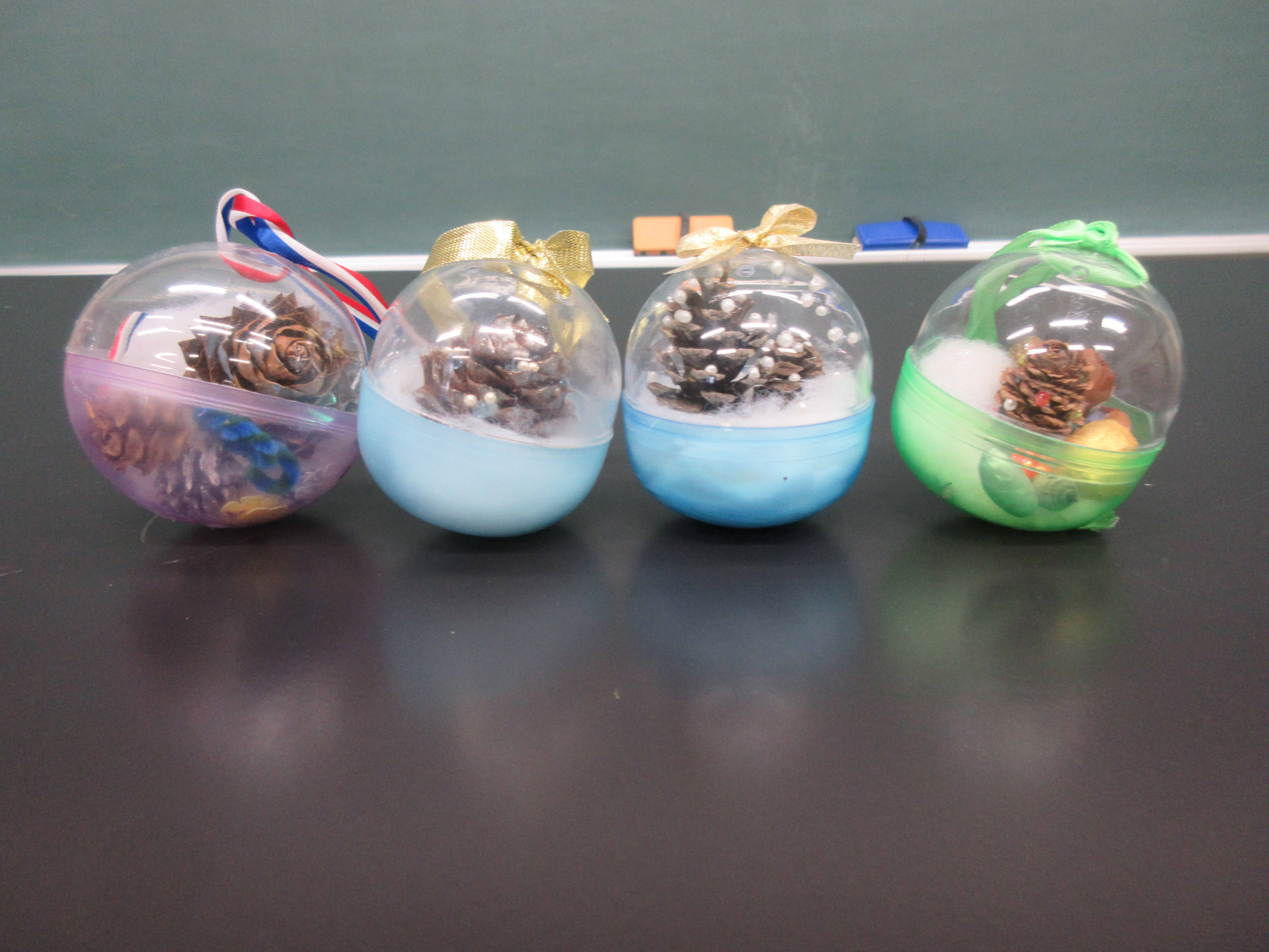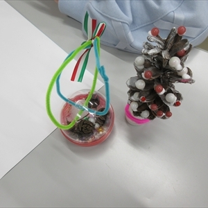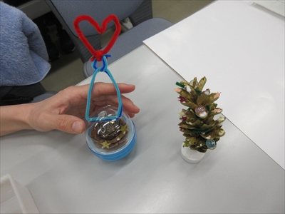 モールやビーズなどを使って飾り付けていきます。カプセルの下に綿をつけて雪を表しています。