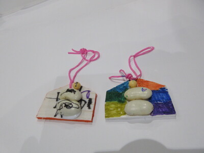 様々な色の糸が付いた小さな絵馬風の土台を選び、そこにインゲン豆とBB弾を乗せてボンドでくっつける作業を行いました。