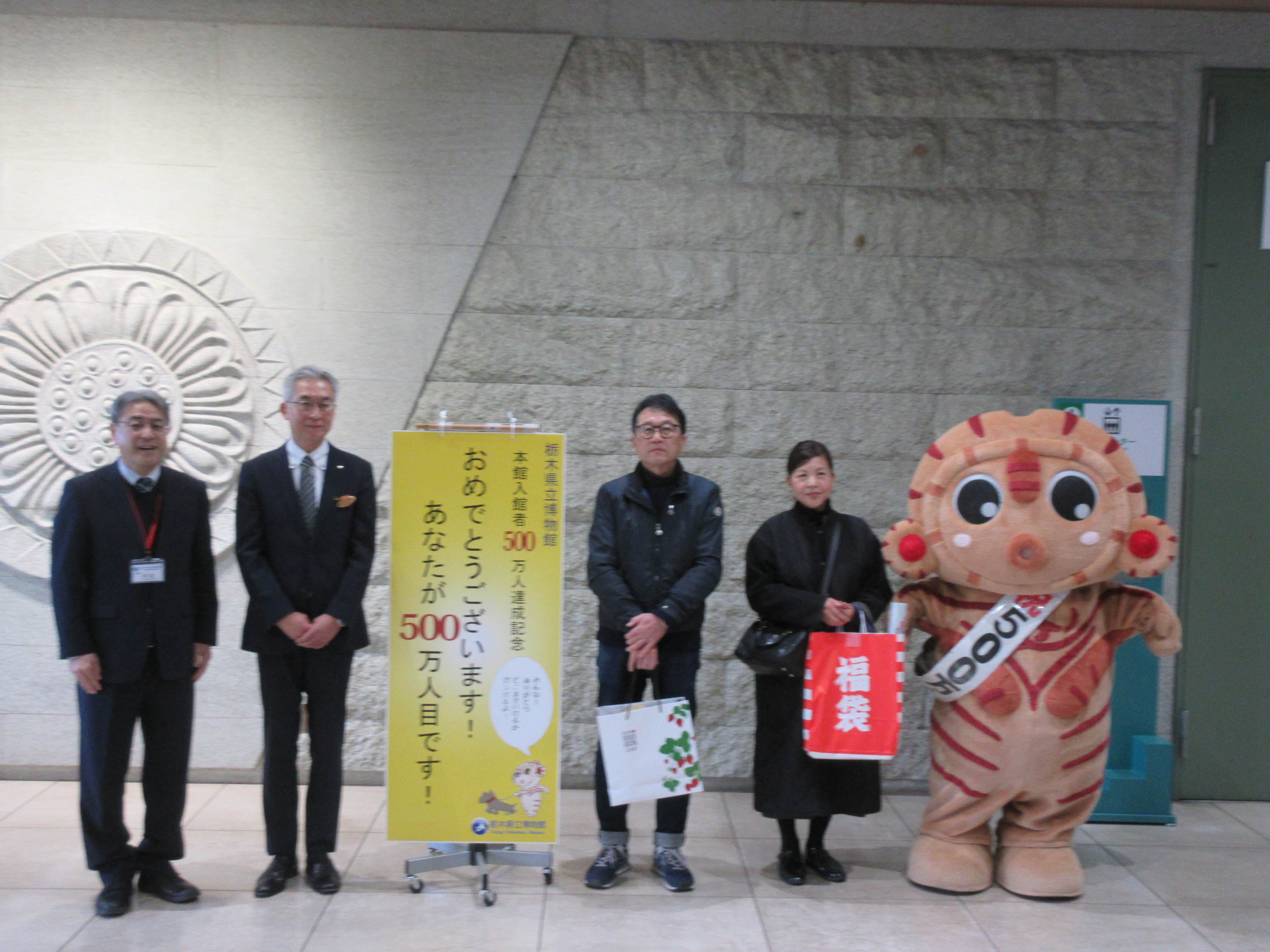 本館来館者500万人セレモニを行いました!! 本日(1月14日)、栃木県立博物館の本館入館者が500万人になりました! 500万人目のお客様は、那須町からお越しの篠原様ご夫妻でした。 篠原様は、現在開催中のテーマ展「栃木の遺跡」を目的に、今回初めて栃木県立博物館に来館されたとのこと。 受付で500万人目と知らされて、大変驚かれていました。 みーたん広場にて記念品の授与や写真撮影を行った後、テーマ展担当者による展示解説にご参加いただきました。 大変におめでとうございました! 栃木県立博物館は、これからも多彩な展示で、皆様の来館をお待ちしています。ありがとうございました 前の記事 コメント コメントする コメントの投稿 コメントの返信 コメント (スタイル用のHTMLタグを使えます) 名前 電子メール URL サインイン情報を記憶