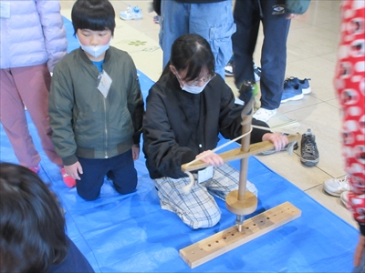 最後は火おこし器です。今回体験していただいているのは、まいぎり式とゆみぎり式という火おこし方法です。人々は火をつかうことによって食生活が豊かになり、暖をとったり、動物から身を守ったりすることができるようになりました。