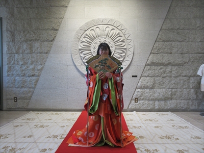 このイベントは十二単の着付体験ではなく、洋服の上から十二単に袖を通して、