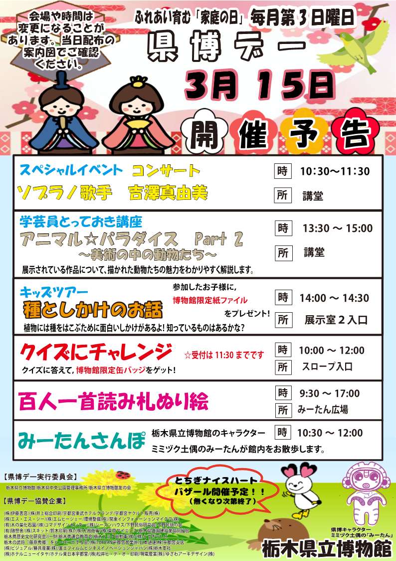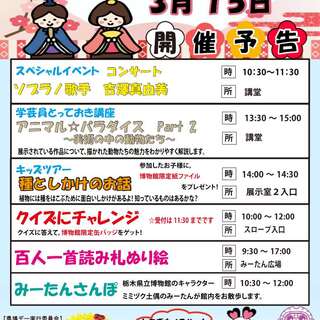 R8.3月県博デーのご案内 【R8.3月県博デーのご案内】 毎月第3日曜日は県博デー!! 今月はスペシャルイベント コンサート ソプラノ歌手 吉澤真由美 学芸員とっておき講座は「アニパラ」 キッズツアーは「種としかけのお話」です。 その他色々!!みーたんもおさんぽします。 是非ご来館ください😌 前の記事 コメント コメントする コメントの投稿 コメントの返信 コメント (スタイル用のHTMLタグを使えます) 名前 電子メール URL サインイン情報を記憶
